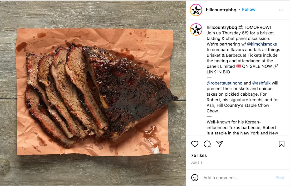 For ticketed events that require registration, restaurants can not only post about them — they can link to a ticket purchasing site right from their Instagram profile. In the above example from Hill Country, the caption outlines when and where the event is with a callout to the ticket link, followed by more details on what the event entails. This example is accompanied by a mouth-watering picture of brisket, but events can also be promoted using custom graphics made on a design tool like Canva.