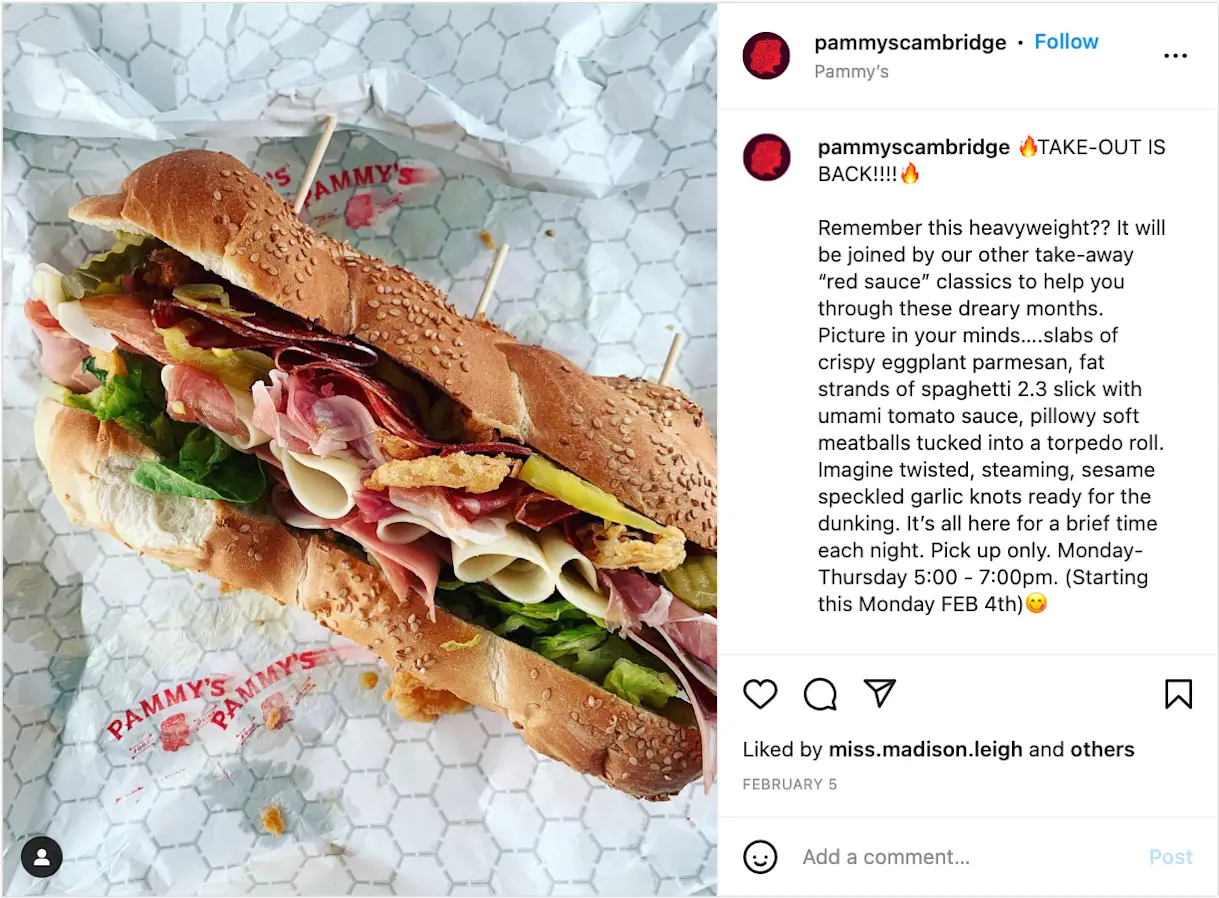 Having “comment below!” or “like this post!” in every caption isn’t the move here. Instead, follow the example above set by Pammy’s. They announced that their takeout menu was back and posted a super tasty looking hero sandwich with a prompt to “Tag a friend you’d like to get cozy and share a HERO with!” The post received lots of engagement and chatter in the comments.