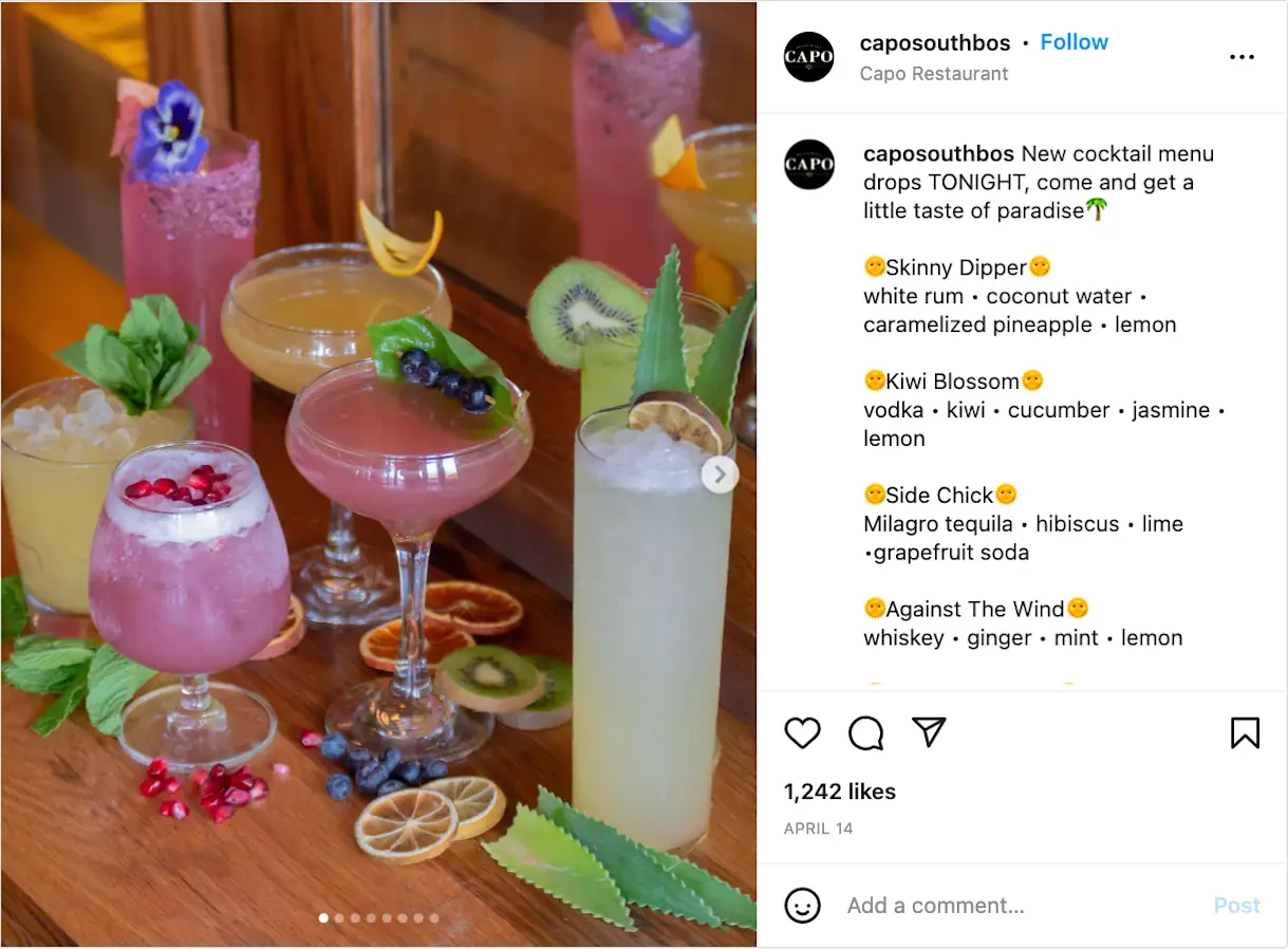 In this example, Capo uses an Instagram carousel to show a photo of all the drinks on their new cocktail menu and you can tap through to see individual shots of each sipper with a description in the caption.
