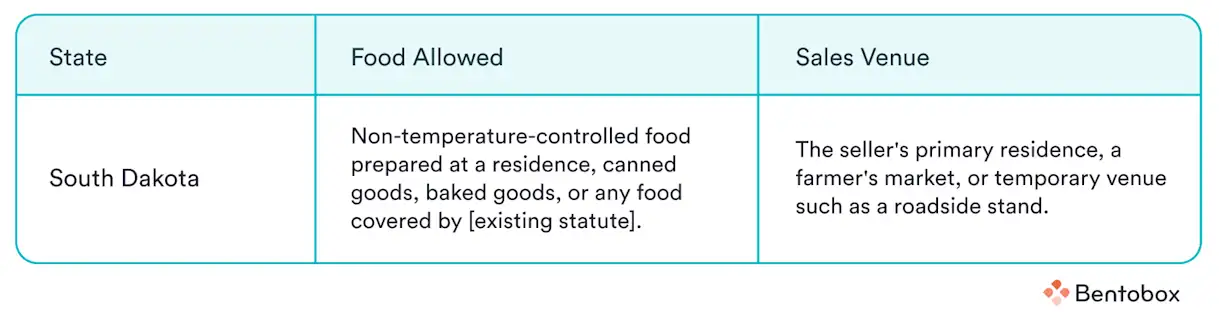 Cottage food laws vary state by state, and they vary a lot. (Cross-state sales are not permitted by any U.S. cottage food laws.) Some states are permissive, like South Dakota, which says that non-potentially-hazardous food can be sold direct to consumers as long as a label clearly identifies its origin.