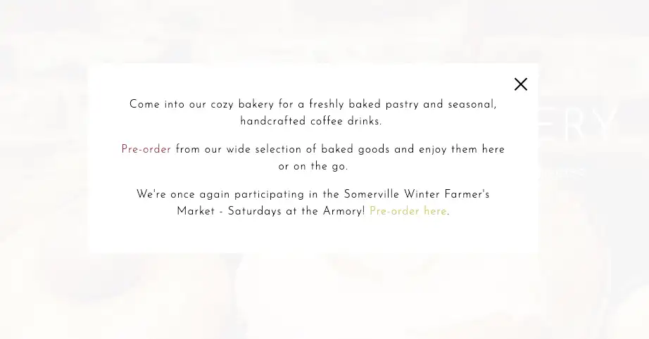 If the relationship between your restaurant and the cottage food producer is stable, consider selling food alongside them. The most common place in the U.S. to find cottage foods is at farmer’s markets or similar DIY pop-up events. Events like these are great places to sell your food and promote your brand. Mariposa Bakery in Cambridge, MA promotes their farmer’s market availability with a succinct pop-up notification on their website.