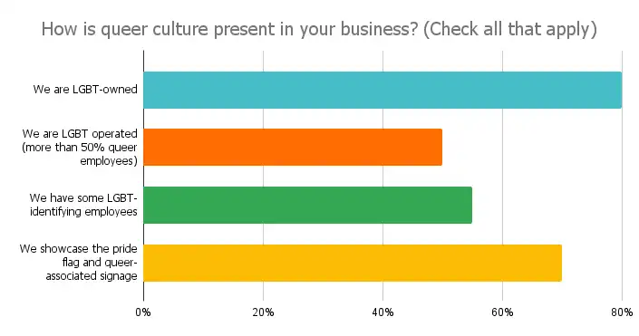 Discrimination, of course, remains prevalent in many places and hinders LGBTQIA+ businesses’ ability to thrive. In our survey, one owner of a market and fast casual restaurant reflected on the issue: “With any form of visibility, people from both sides make their feelings known. Generally our customers are very supportive, but there has been targeted harassment, and our team converses daily about safety strategies for our employees and customers.”