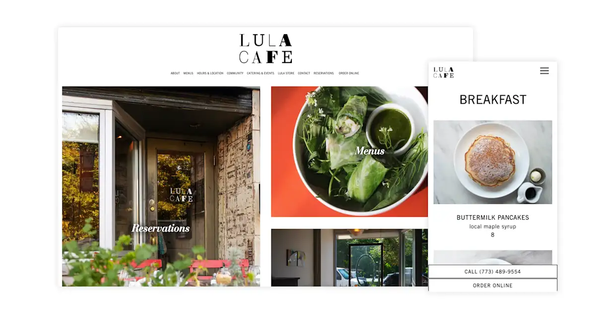 Lula Cafe is an inventive, market-driven restaurant that serves one of Chicago's most popular brunches. Chef Jason Hammel started the restaurant with his wife Amelia Tshilds in 1999, and although he was self-taught, he has grown into a two-time James Beard Award finalist for Best Chef Great Lakes. The cafe's website opens with large photo thumbnails that direct guests to key sections of the website (reservations and menus) with clickable buttons. The menu page is text-based — a key SEO tactic for restaurants — and includes beautiful pictures of menu items.