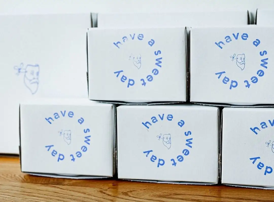 What’s a quick, cost-effective way to brand your delivery boxes memorably? Take a page from this bakery, which places their evocative, distinctive logo in the middle of a stylish circular wordmark, all stamped onto an elegant white box. The delivery design is trendy, thoroughly on-brand, and easy for busy staff to execute.