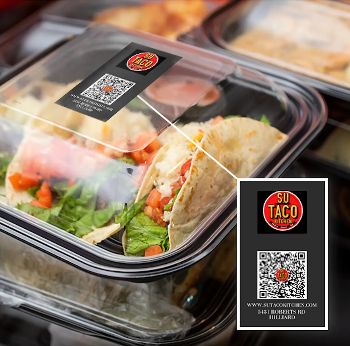Delivery packaging is a great space to direct customers to digital properties, as this label made by MustHaveMenus demonstrates. Not only does it connect the customer to a website where they can order more takeout (ideally commission-free) but it shows that the brand wants them to engage beyond just this one interaction.
