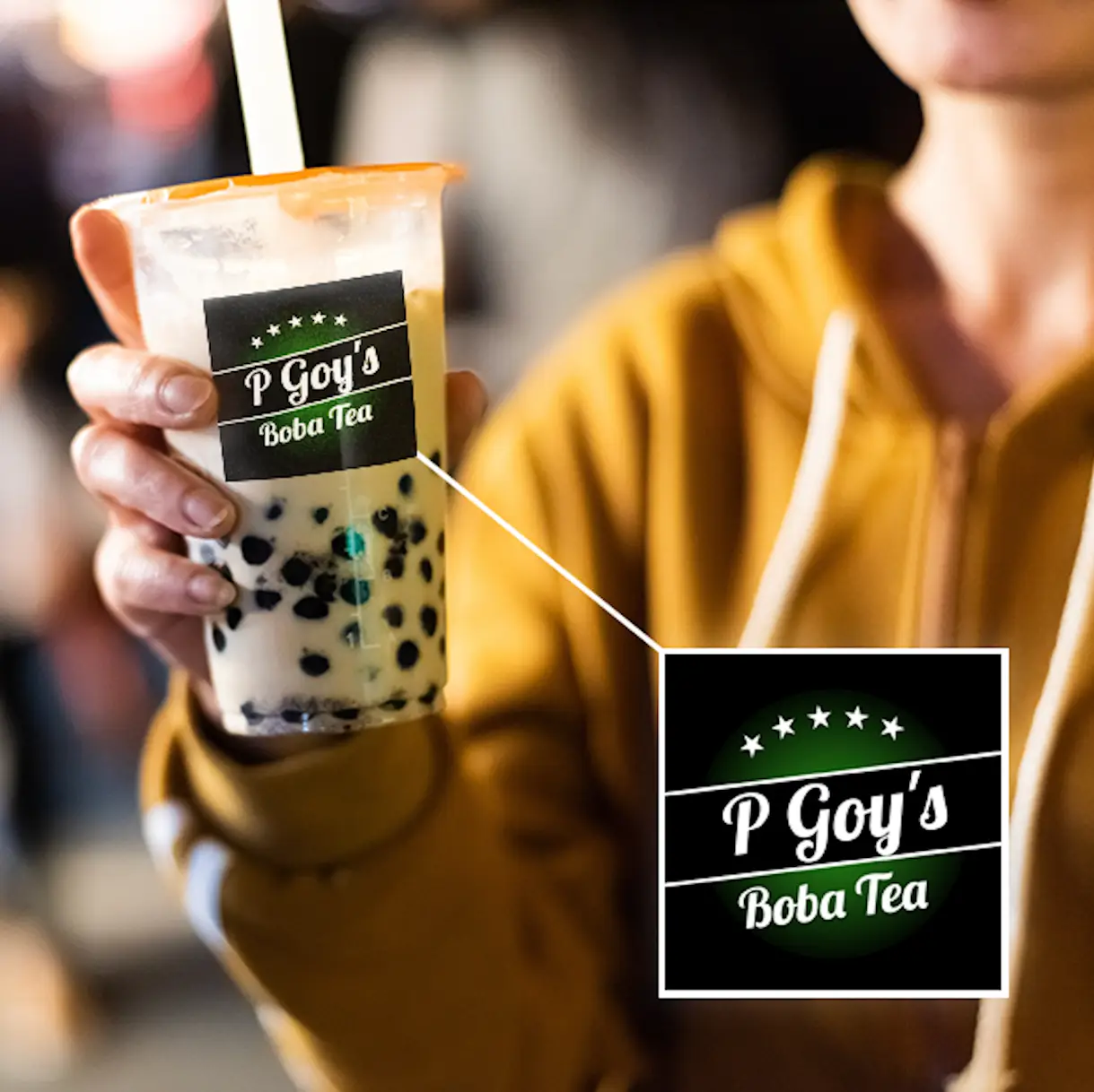 Square stickers make it easy to affix your logo to any piece of takeout packaging. That way, you can turn cups, containers, and bags into extensions of your brand without having to pay for customized, branded packaging. This restaurant’s sticker demonstrates how well a square-cut label can fit a circular logo, displaying the name big and bold so it can be seen at a distance. Attaching the product name, boba tea, to the sticker can also help keep orders organized in the back-of-house.