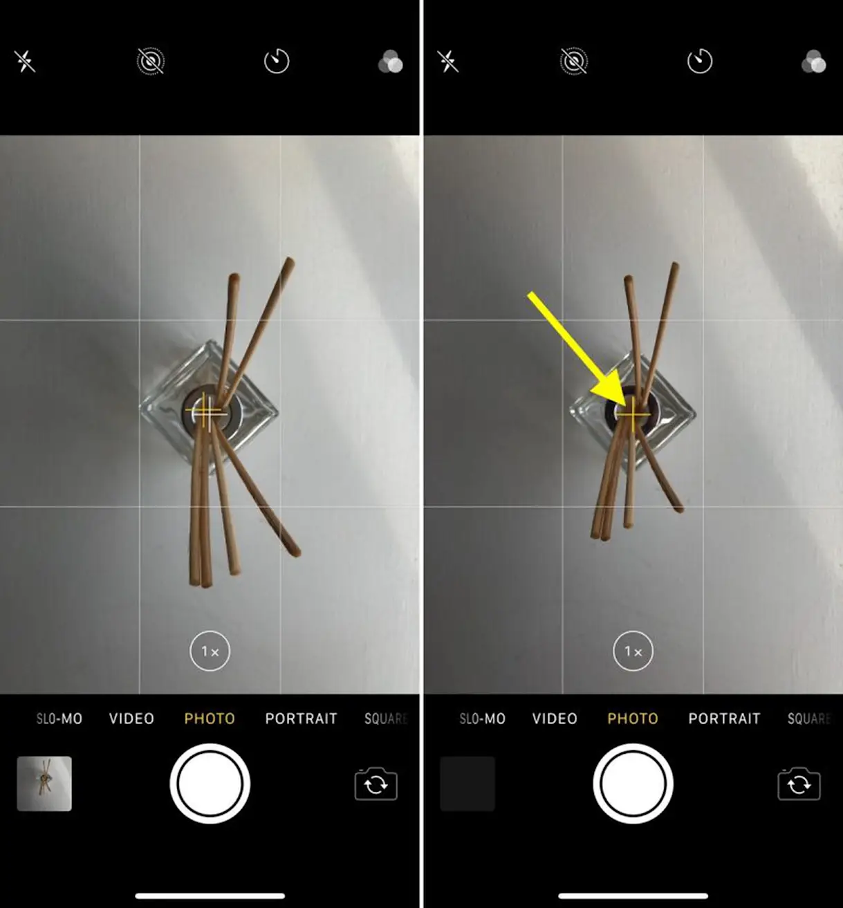 One photo best practice — especially when taking aerial shots of food — is to have the camera lens be level with the ground. When the grid feature is turned on and the camera is pointed straight down, a yellow and white cross will appear on screen. Move the floating cross to match the fixed one, and the photo taken will be level to the ground.