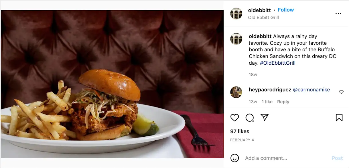 Parallel: For sandwiches and foods that benefit by seeing their height, a shot that captures the layers and size makes the most sense. These shots should have the lens of the camera parallel with the dish, like how Old Ebbitt Grill does on their Instagram page.