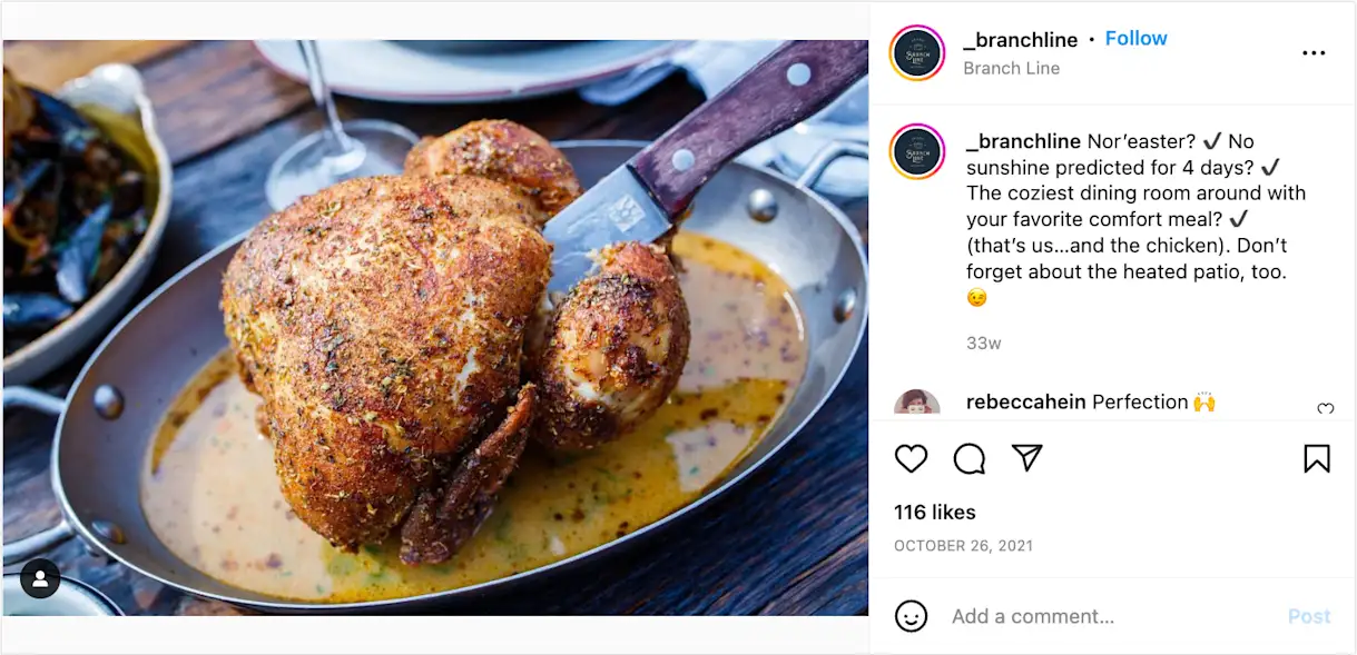 Diagonal: Finally, a diagonal angle works best for thick, rounded dishes to show how the top and the side of the dish looks. Desserts and meat entrees are situations where a 45° shot works best. Case in point — Branch Line uses an angled shot to capture their full full chicken dinner.