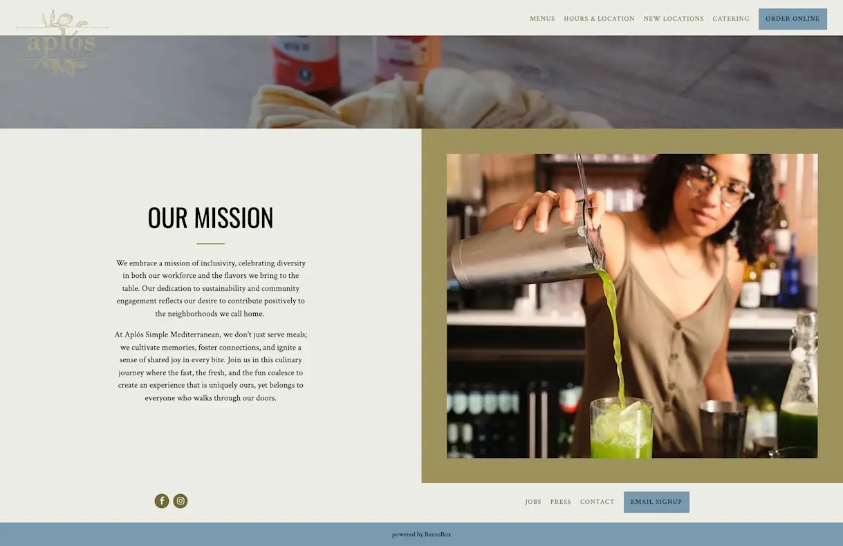 It’s clear that Aplós values equality, and there’s multiple mentions of how that takes shape in both their team and their food. The use of inclusive language, such as "join us" and "belongs to everyone who walks through our doors," reiterates a welcoming atmosphere and further illustrates the interest in customers to be part of the restaurant's community.