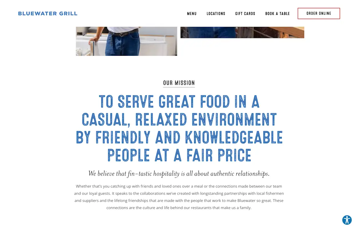 The restaurant’s value proposition — what they’re promising to deliver to their customers — is the focus in this succinct and direct mission statement: offering great food at a fair price. In less than 20 words, Bluewater Grill establishes standards about their ingredients, service, and cost.
