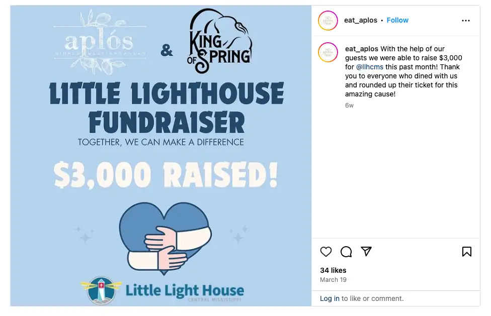 Because Aplós states that community engagement is a core part of its mission, it makes sense for the restaurant to raise funds for a local organization and post about it on their social media.