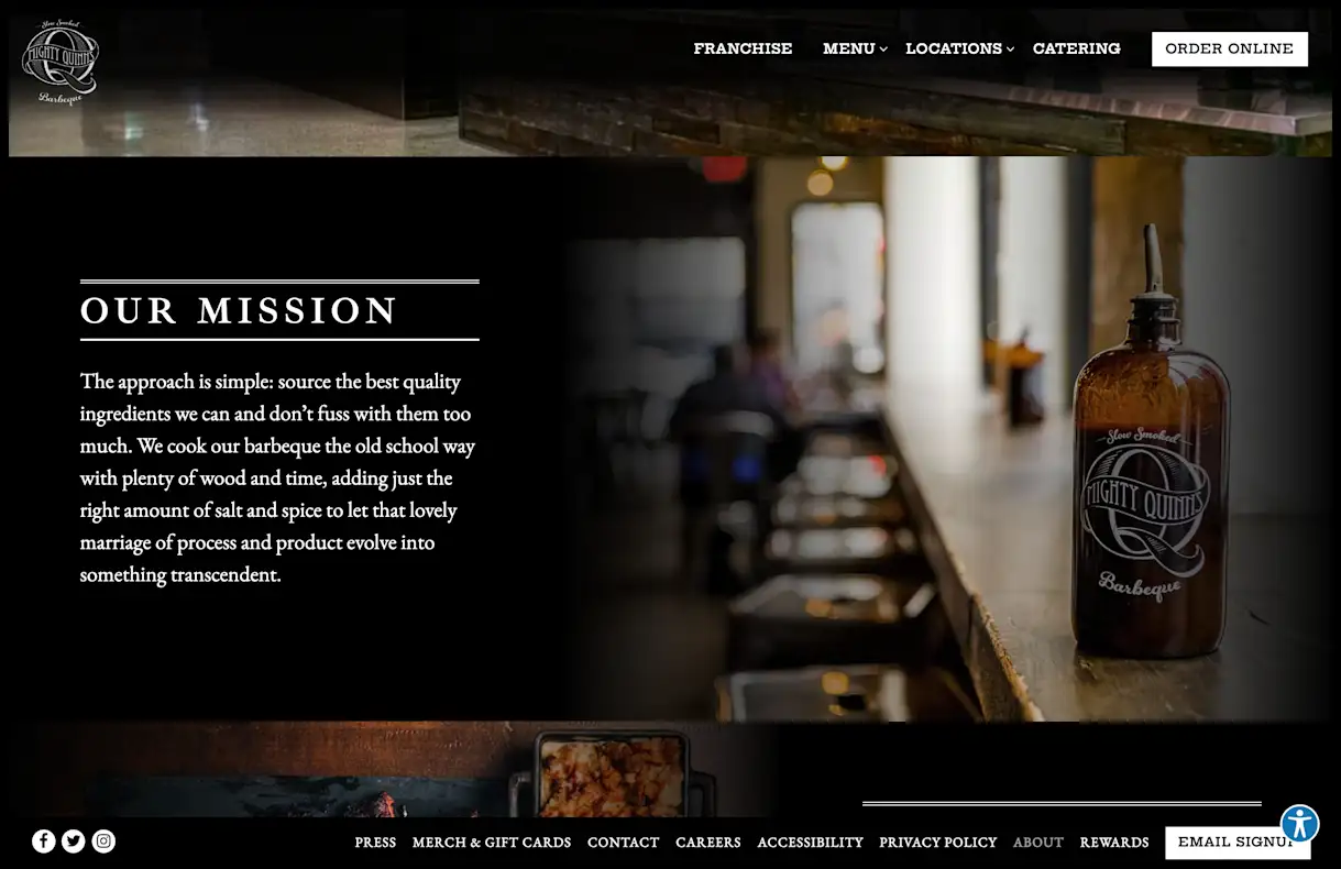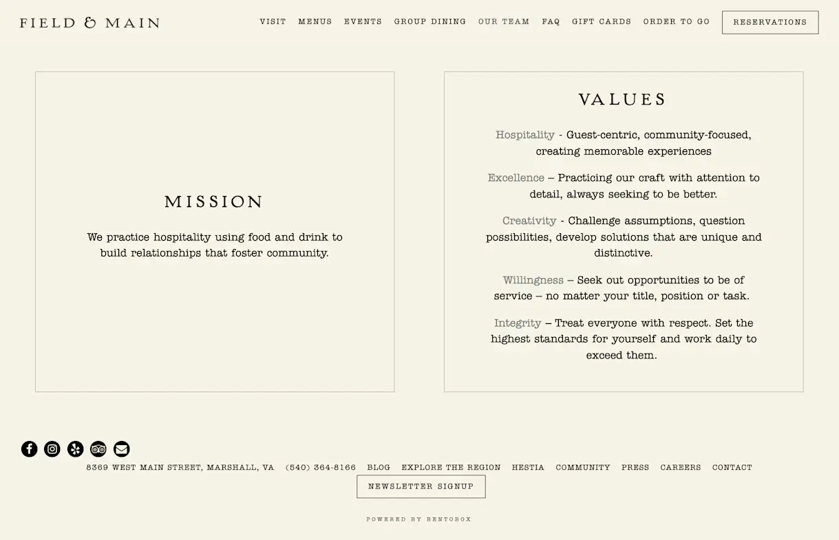 A good mission statement lets diners know what to expect from your restaurant and ideally attracts customers that share similar values. Creating that emotional connection helps build loyalty too. Your mission statement should live on your website so that it’s easy for potential diners and return customers to find. Pages like Our Story or About Us are good spots to place the statement, or you can have a dedicated page that covers your mission, vision, and core values. Field & Main in Marshall, VA places theirs at the bottom of their Our Team page.