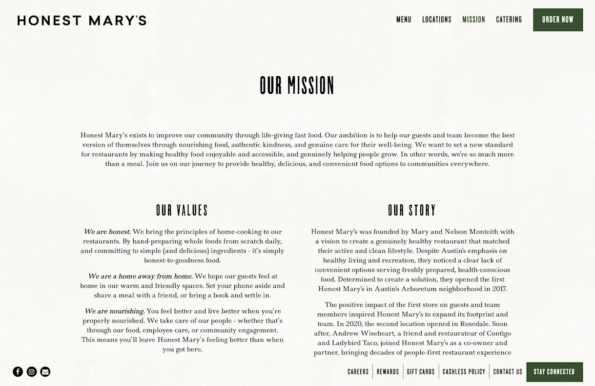 Honest Mary’s values-driven mission statement starts off with their purpose — “improve our community through life-giving fast food.” The phrase “life-giving fast food” is particularly interesting because diners can immediately understand and picture what to expect from this restaurant: quick yet nourishing food where convenience is prioritized without sacrificing quality.