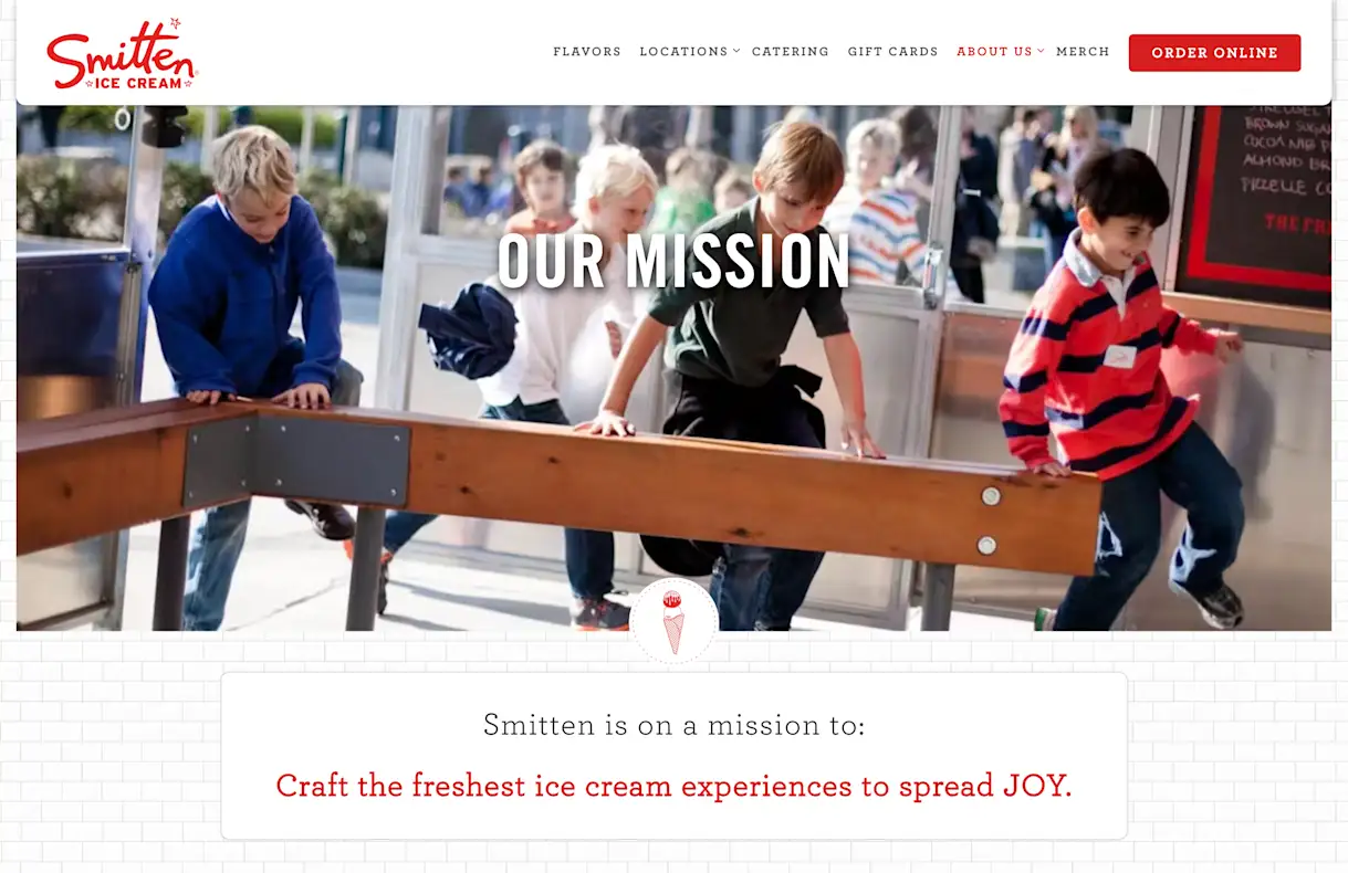 Here, Smitten Ice Cream has distilled their mission statement down into one super clear sentence. It follows a formula of: verb (craft) + descriptive noun (the freshest ice cream experiences) + to + verb (spread JOY). The simplicity of the statement is what makes it work so well — there’s no fluff or filler, just easy to understand language with an emotional appeal.