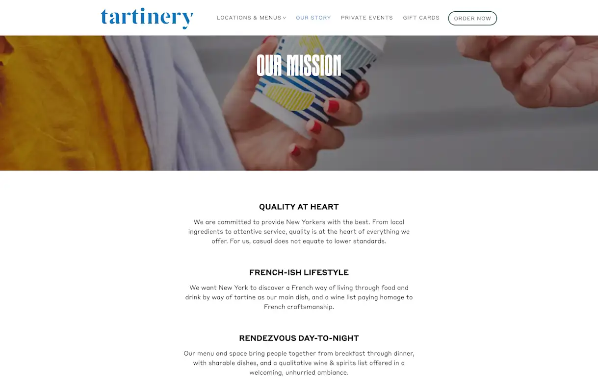 Tartinery’s mission statement is broken down into three sections, which makes it easier to remember for both staff and diners. The section headers are uniquely phrased and feel specific to the concept. The larger descriptions underneath each section expand on the key points and provide additional context. New York/New Yorkers are mentioned throughout, so it’s clear who the target audience is. Overall, this mission does a good job of stating what they aim to do (“provide New Yorkers with the best,” “bring people together,”) and how the restaurant will do that (“by way of tartine as our main dish,” “with sharable dishes, and a qualitative wine & spirits list offered in a welcoming, unhurried ambiance”).