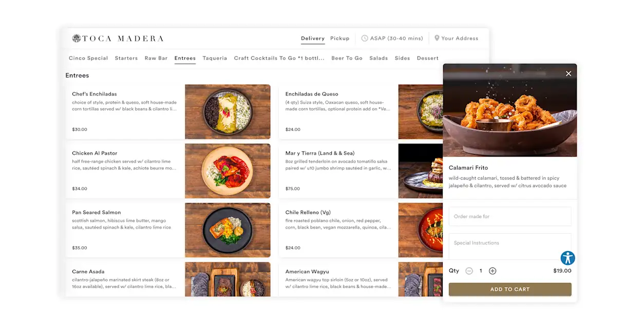 Online Ordering: Online ordering menus need to be designed for digital conversion. This means they should follow the playbook and best practices of e-commerce design: organized navigation; mobile optimization; heavy use of thumbnail images; and clickable menu items that expand for customization. BentoBox online ordering has a 98% checkout rate on cart additions, which makes sense when you see how customers like Lost Larson and Toca Madera put it to use.