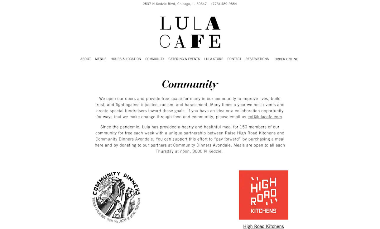 Lula Cafe in Chicago has an entire page on their website dedicated to their community efforts, which includes details on their partnerships. There’s also a call to action on how to reach out to coordinate fundraisers with the restaurant.