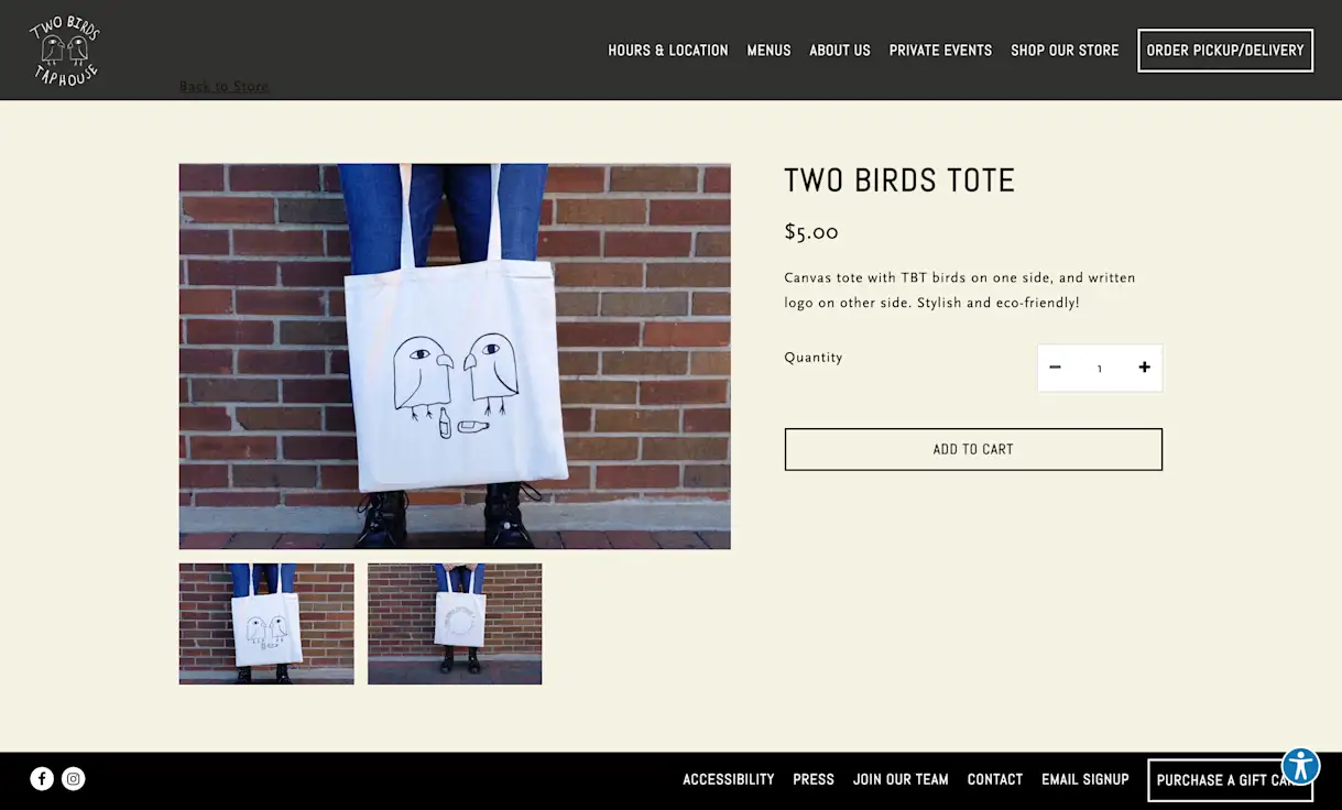 One specific way to turn customers into marketers is by selling wearable restaurant merchandise like hats, shirts, totes, and hoodies. Georgia brewery Two Birds Taphouse, for example, uses its online merchandise store to sell tote bags with the restaurant’s logo, turning wearers into walking billboards for the business.