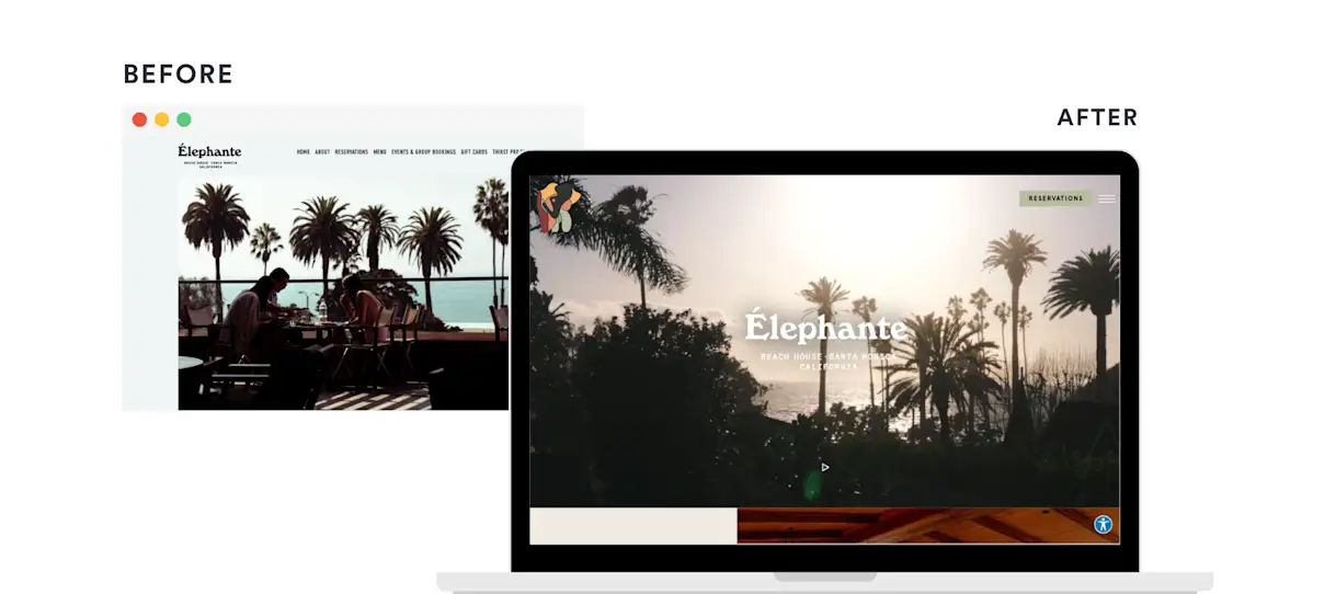 Elephante Beach House overlooks the Pacific Ocean, but guests can be forgiven for feeling transported to the Southern Mediterranean. The same is true of website visitors, who are greeted on the homepage by a relaxing, full-bleed video of palm trees rustling before a sunset. The new website also prominently features the restaurant's eye-catching logo, which uses earthy colors to match the Southern Italian and Northern African decor of its concept.