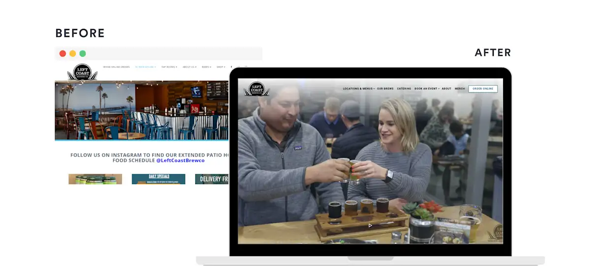 Like Boucherie, Left Coast Brewing Co. updated its homepage to start with a beautiful custom video. Though the concepts are very different, the videos serve a similar purpose: Showcasing the mood, food and energy of the space. This is extra important for a business like Left Coast Brewing, which has fashioned an ideal environment for beer drinkers to hang out and sample its creative menu of brews. Without a proper space for video, its old website couldn't communicate that as effectively.