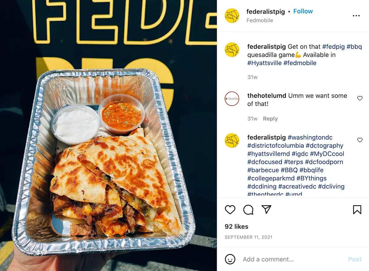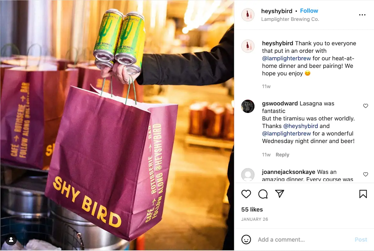 Boston restaurant Shy Bird does this with a simple “Follow Along @HeyShyBird” on its to-go bags, and it has thousands of followers to prove the effort’s worth. Having big, bolded text clearly laying out the restaurant’s Instagram handle makes the follow sound enticing, especially if the contents of that bag are as delicious as promised.