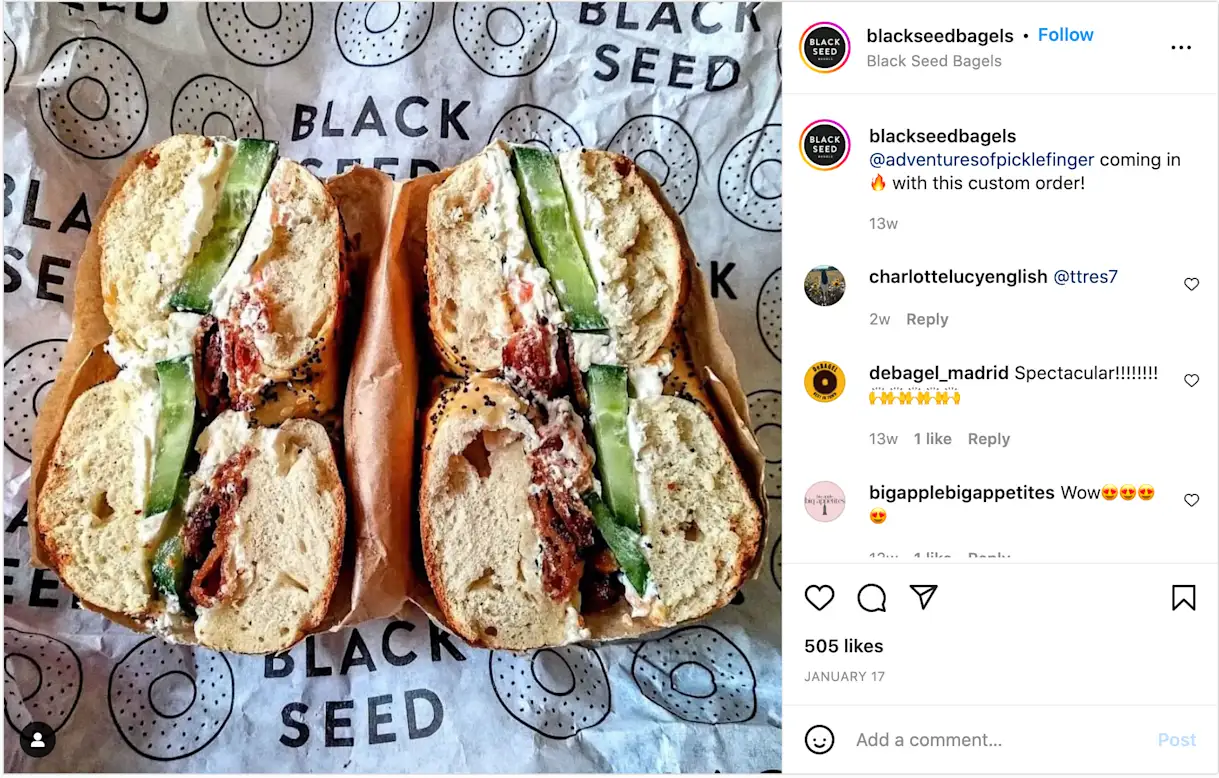 Restaurants can use deliveries to cement their brand on packaging and food wrappers. For example, rather than relying on generic packaging, custom designs like Black Seed’s bagel wrappers add legitimacy to a restaurant as more than just a generic meal provider.