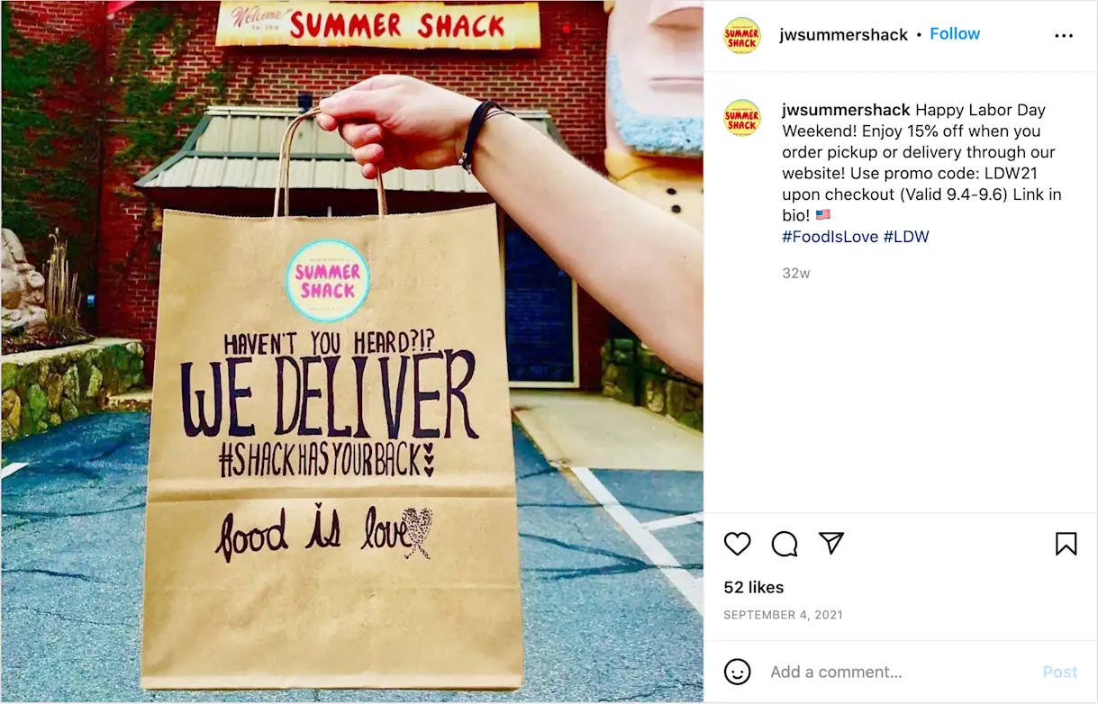 Promoting direct options on packaging can drive first-time and repeat customers to place their next order right through your restaurant. For example, if bags and food packages are stamped with a “Get 10% off your first order when you get delivery from OurRestaurant.com,” you could see a shift away from app orders and towards your restaurant’s own online ordering software. This approach was taken by Summer Shack in Boston, which also promoted the revenue-retaining move on Instagram.