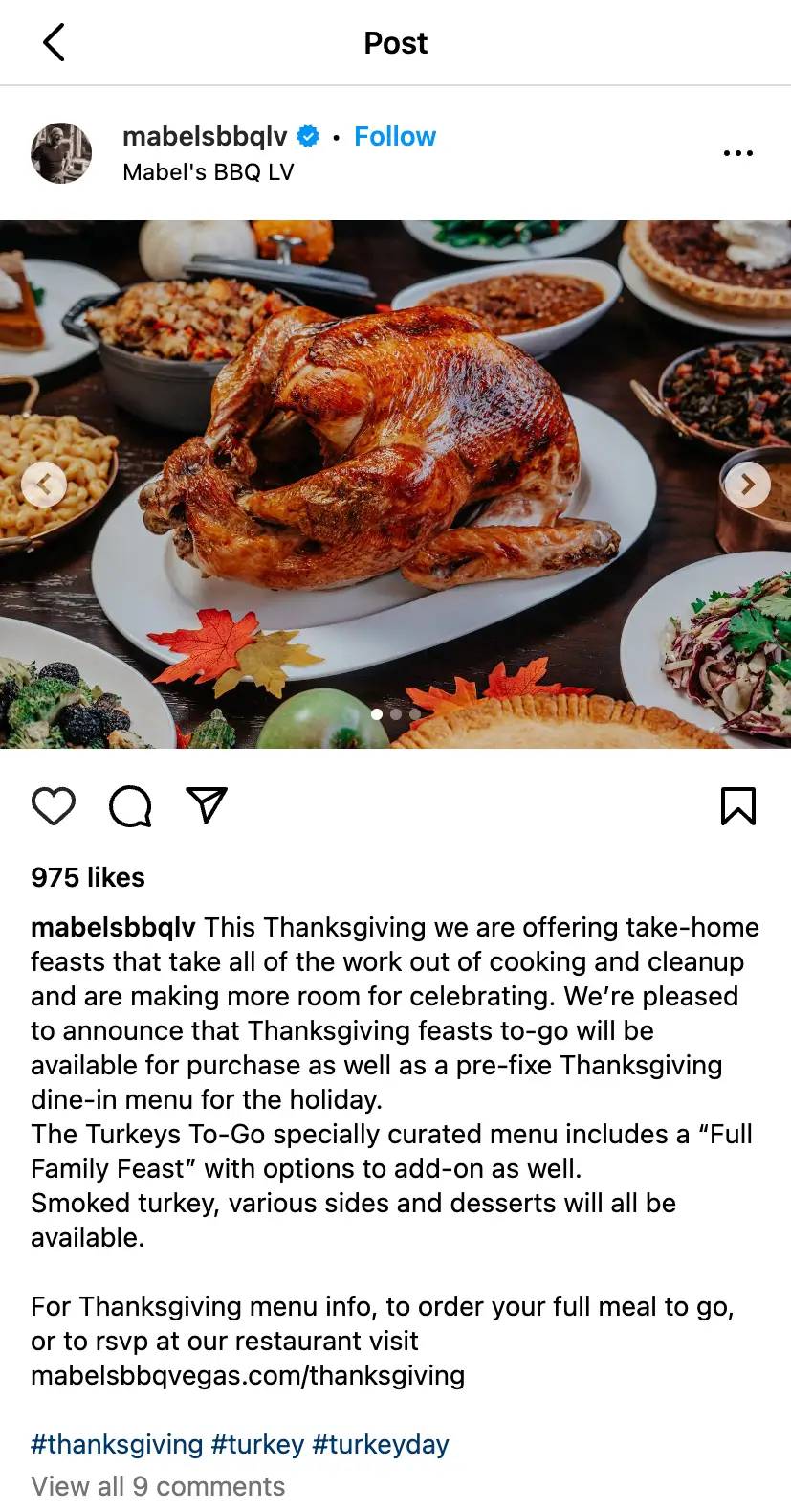 But here’s the most important part — restaurant’s need to get this information out. Mabel’s BBQ in Las Vegas promotes their Thanksgiving take-home feasts on their Instagram account, directing visitors to their website to place an order. This is a perfect example of how marketing efforts can drive revenue.