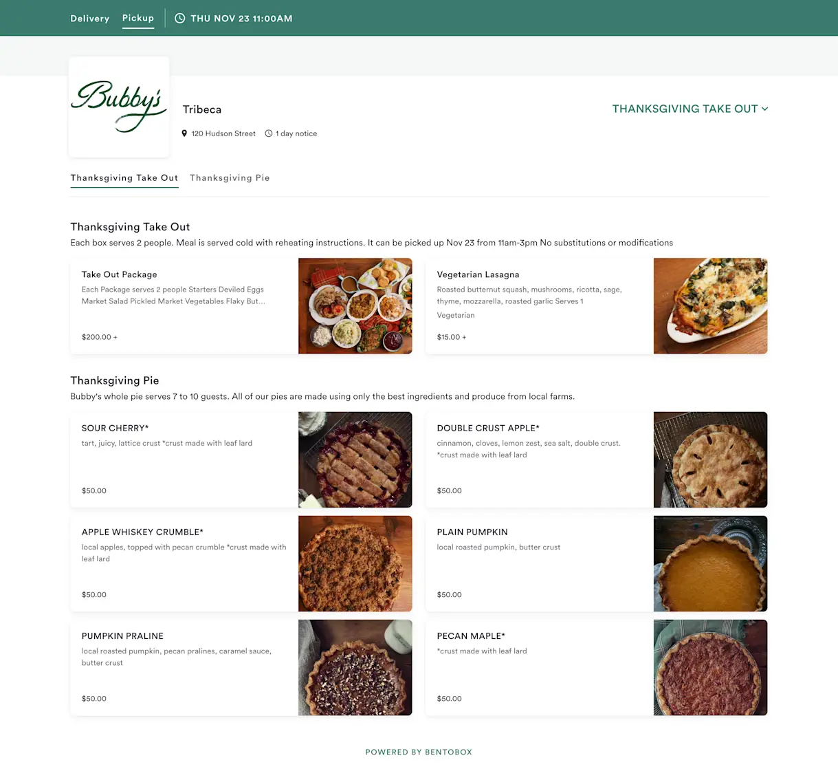 The time to get started is now. Set up online ordering in less than 7 days with BentoBox, or begin capturing catering orders through Pre-Order & Catering — all on the restaurant’s website. These tools are essential for driving holidays orders while boosting revenue and are the source that all marketing efforts should lead back to. To learn more about these tools and how BentoBox can help, get in touch with a specialist today or reach out to your account manager.