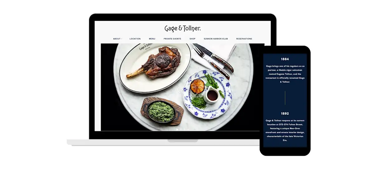 Opened in 1879, Gage & Tollner led as an example of restaurant excellence and top-notch hospitality for 125 years until closing in 2004. New ownership brought it back in April 2021, restoring a pillar of the Brooklyn community and honoring its legacy with new ambitions and traditions. Its website highlights its history with past and present photography, a creative timeline and custom design nods to its art-deco past. Its nautical-themed cocktail bar, Sunken Harbor Club, has a dedicated page that gives the upstairs bar its own identity but remains part of the Gage & Tollner brand. In short, its website celebrates its legendary reputation and upholds its standard of excellence for the modern-day.