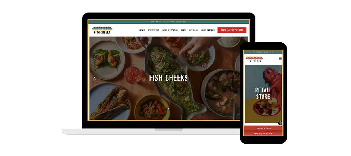 Fish Cheeks in NOHO recreates the convivial and communal dining in Thailand with contemporary Thai cuisine in a vibrant atmosphere. Its website replicates its bright interior design with its signature red, green and yellow tones and fish scale pattern. The logo atop the page gets the animated treatment, adding a playful and casual vibe that evokes the flashing street-stall signs in Thailand, while high-resolution food photography invites visitors to explore its menu. In addition to setting the vibe and expectations for diners, its website drives revenue with pre-order & catering for boxed lunches and larger gatherings.