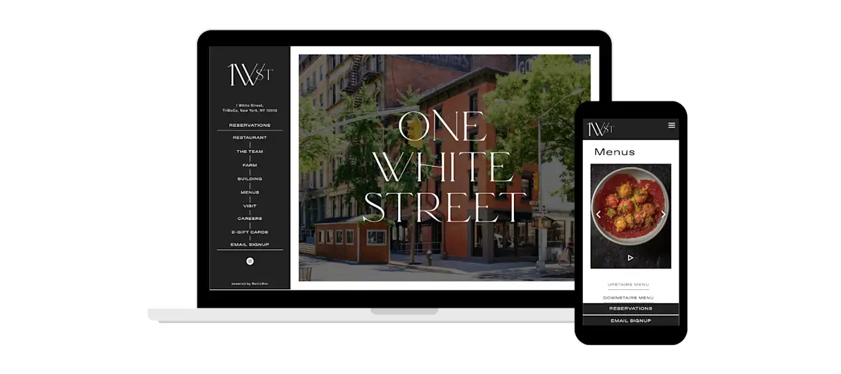 Located in a historic Tribeca townhouse, One White Street serves globally inspired dishes two ways: downstairs with an a la carte menu and wine bar and upstairs with a six-course tasting menu. The townhouse-turned-restaurant merges fine-dining and casual-fine dining with its sophisticated yet cozy interior and neighborhood vibes. Its website captures this essence with clean lines; sharp, almost art-like photography and charcoal and white tones. Its simple navigation guides visitors through the ethos of One White Street, giving future diners a glimpse into its dining experience.