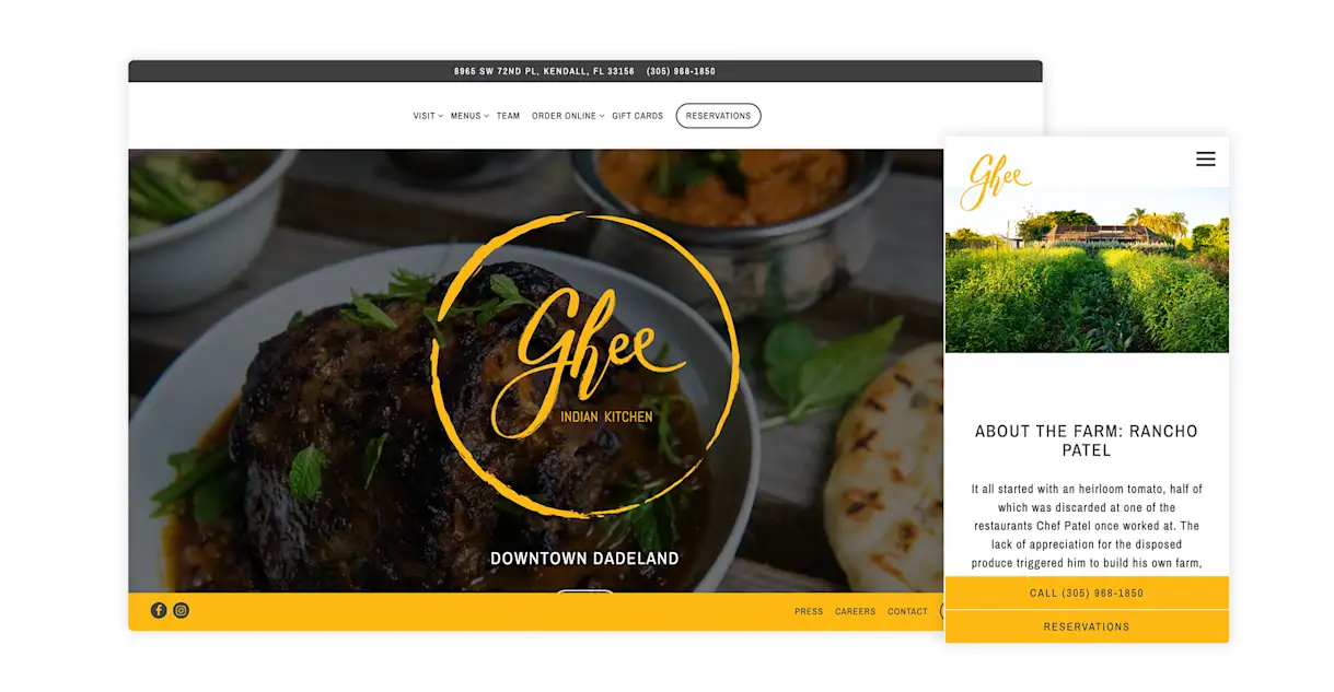 Since opening in 2017, Ghee has been so successful that it earned chef Niven Patel a spot on Food & Wine's 10 Best New Chefs list. Patel himself is central to Ghee's identity, and its website does an artful job making his presence felt. The homepage includes a quote from Patel, who explains that he wants guests "to walk into Ghee with the sense of entering my home," and a separate page introduces Rancho Patel, the farm he owns in Homestead that famously supplies all of Ghee's produce.