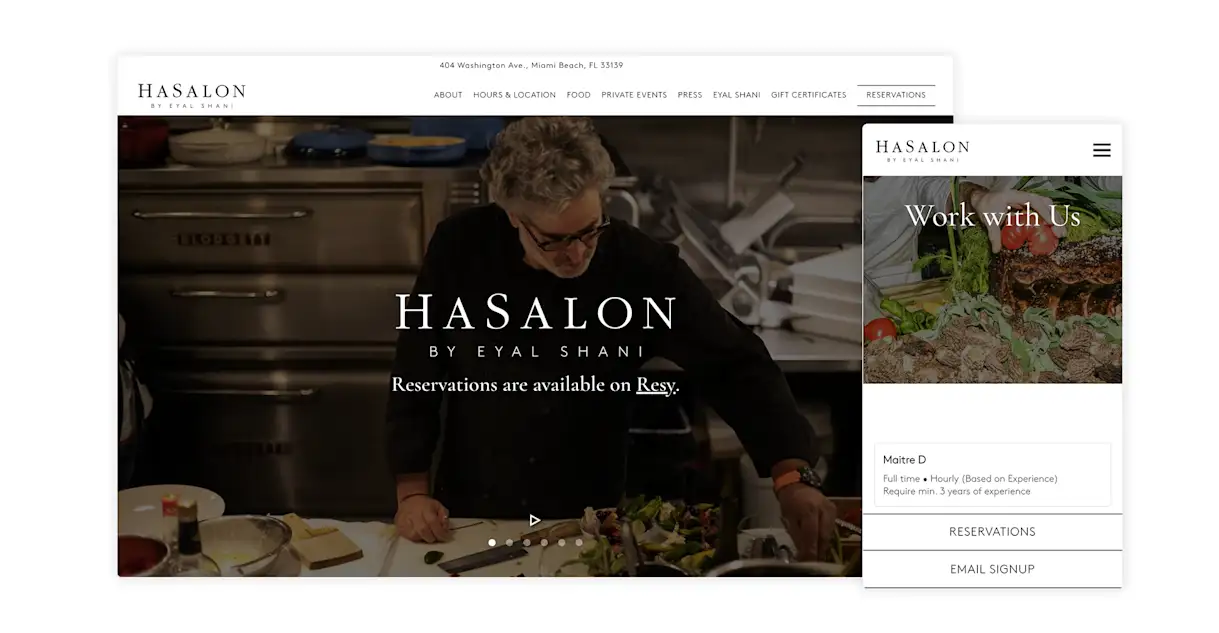 Major Food Group helped bring HaSalon to Miami — just as it did with Carbone, Coconut Grove and ZZ'z Club — but chef Eyal Shani is HaSalon's frontman. The upscale Israeli restaurant puts Shani front and center on its website, with his name and image prominent on the homepage and his impressive career outlined on a standalone page. It's a smart approach for this and other chef-driven concepts, though the website doesn't just focus on Shani: it also outlines the menu, accepts private event inquiries and has an impressive job applications page with open positions.