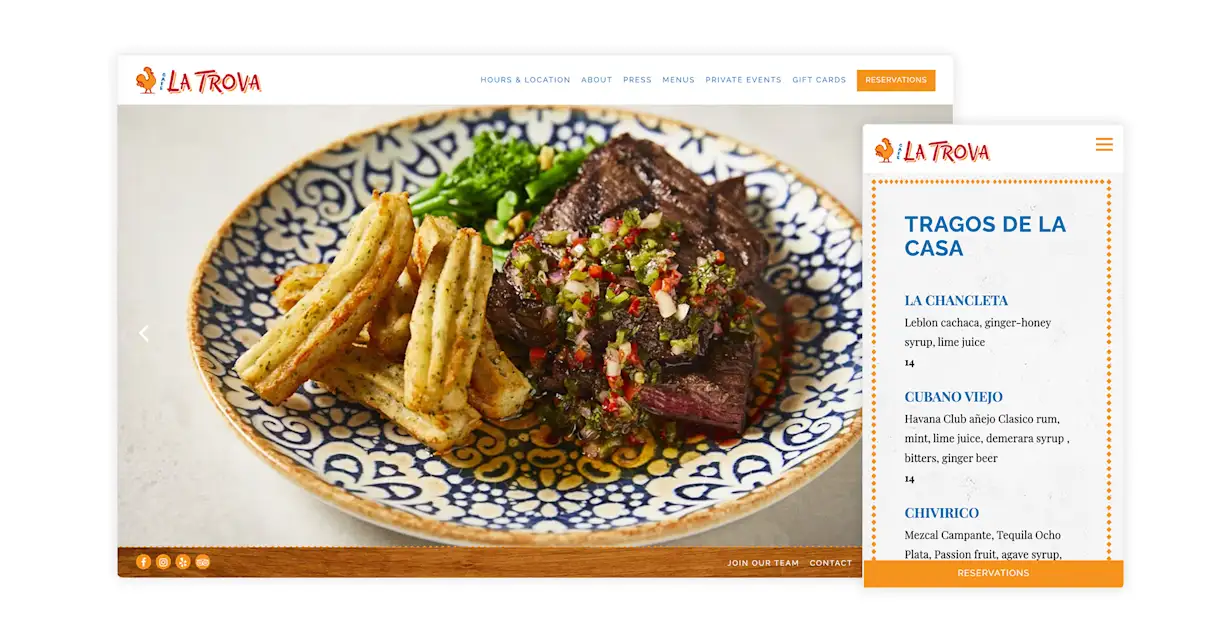 Cafe La Trova's founder, Julio Cabrera, is a world-renowned cantinero who helped the restaurant earn a spot on the World's 50 Best Bars list. Its head chef, Michelle Bernstein, is a former James Beard Award winner and local culinary legend. Those are pretty impressive bona fides, and its website does a skillful job communicating them while also defining its own brand and letting photos of its Cuban-inspired food, drinks and venue do the talking.
