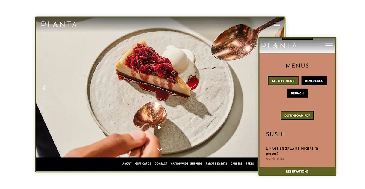 The branding, design and menu photography on Planta's website successfully appeal to audience #1, while the sleek and intuitive menu page appeals to audience #2. The menu page also uses text-based descriptions in addition to PDFs, which improves SEO and drives more organic traffic to the site — an important consideration for all restaurants, but an especially important one for restaurants that cater to dietary restrictions.