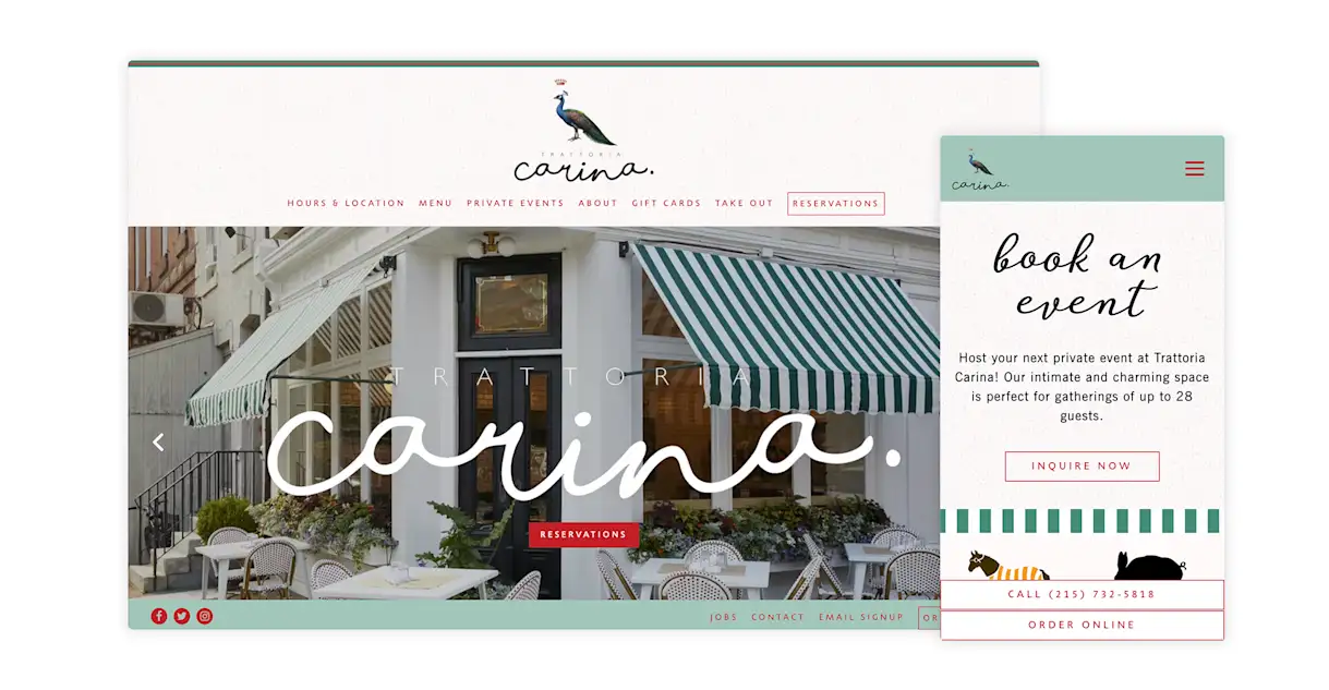 Trattoria Carina is the definition of a "neighborhood Italian spot." The dining room seats barely over 30 people, but it bustles with a motley crew of homemade pasta and wine lovers — be them families, first dates, business partners or party owls. Its website uses a smart combination of lifestyle photography for the space and food photography for the menu, while also effectively pushing guests to pages for reservations, online commerce or private event inquiries.