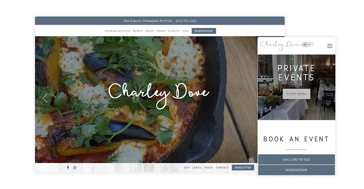 From a brand perspective, few restaurants face a more unique challenge than Charley Dove. In some ways, it replaced Rittenhouse Square institution Audrey Claire; in other ways, it simply rebranded it. Regardless, its website toes a delicate line between preserving what made Audrey Claire great — a hole-in-the-wall attitude with an award-on-the-wall menu — and charting its own path as Charley Dove. It does this with a smart mix of photography and design elements, while always keeping the script-font restaurant name prominent.