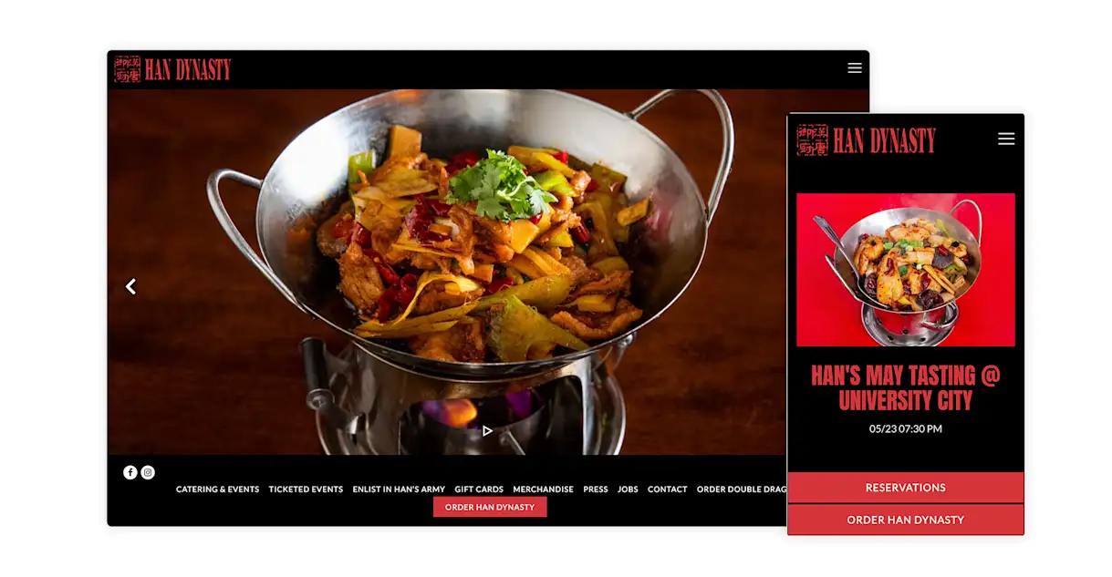 Han Dynasty is a remarkable local success story. The first location opened at a strip mall in Exton, but its authentic Sichuan cooking earned it immediate fans and accolades. It has since expanded to 11 total locations, including three in Philadelphia and four in New York City. Its website captures the spirit, personality and passion of its brand, while also driving business with native features such as restaurant event tickets.