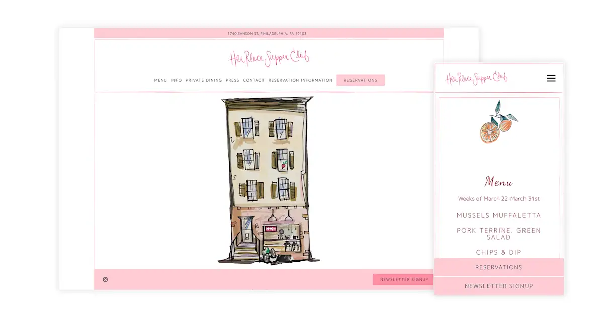 When Amanda Shulman launched Her Place Supper Club in June 2021, she wanted it to feel like "going over to your mom's house for dinner." The menu is set. The plates all come out at once. And the food is so good that Shulman was nominated for the Best Emerging Chef James Beard Award. Capturing this on a website is a difficult needle to thread, but with quaint illustrations on the homepage and menu pages, Her Place's website evokes the restaurant's charm. It feels like an absurdly talented mom-slash-artist did the web design, just as the meal tastes like an absurdly talented mom-slash-chef did the cooking.