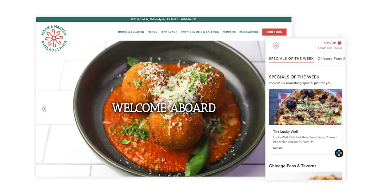 Opened in October 2021, Hook & Master was Iron Chef Jose Garces' first new brick-and-mortar in seven years. In addition to Chicago-style pizzas that harken back to Garces' roots, the nautical-branded restaurant serves an impressive menu of seafood small plates. Its website captures this duality with nautical colors and logos and copy that reads "Welcome Aboard," alongside photos of the diverse menu. It also drives substantial commission-free revenue with BentoBox online ordering, an optimized platform that allows it, among other things, to elevate its weekly specials for online customers.