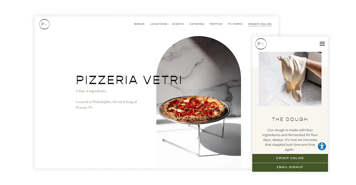 Pizzeria Vetri's website is a masterclass in restaurant copywriting. The hero visual introduces the concept of "4 days. 4 ingredients," which it later elaborates refers to how its dough is made: four ingredients fermented for four days, always. It also positions its pies like snowflakes, claiming that "no two pizzas at PV are the same" and calling them "perfectly imperfect." Especially when combined with the rustic design of the website, this language establishes Pizzeria Vetri as confident, authoritative pizza experts — and that's all the reason guests need to try their pies.
