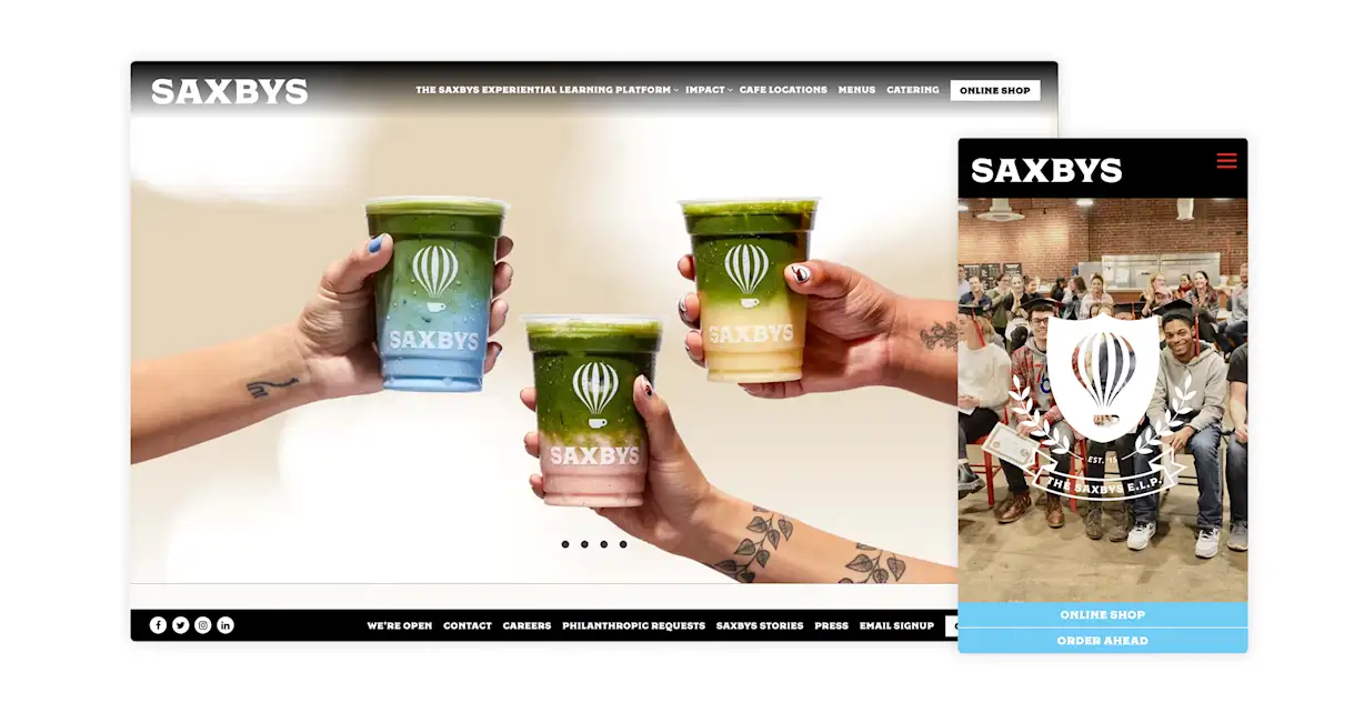 Saxbys has more than 20 locations, but it's headquartered and primarily located in Philly. Having already built brand awareness with many guests in its target audience, its website focuses on building brand equity through purpose-driven campaigns and initiatives. This includes a description of its Experiential Learning Platform, which helps provide education to student employees, along with full pages about its social impact and mission. Its merchandise store is filled with at-home coffee supplies, making it easy for site visitors to support them and their mission — while also brewing a great cup of joe.