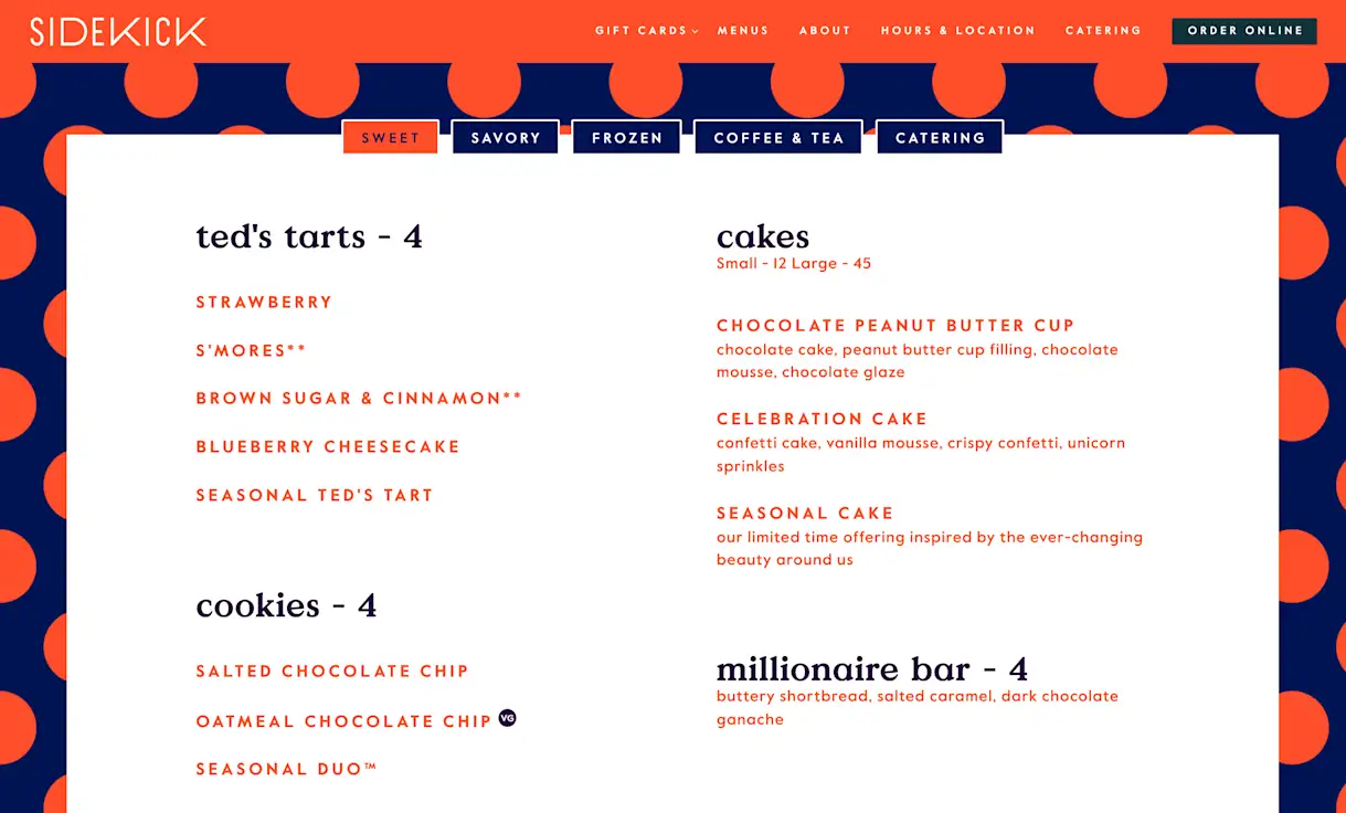 Online Menu Design: Don’t make the mistake of uploading a PDF menu to your website — this is a big no-no for restaurant SEO. Text-based menus are the way to go and restaurant website builders like BentoBox make it simple to set up. Sidekick Bakery in Arlington, Virginia is a great example.