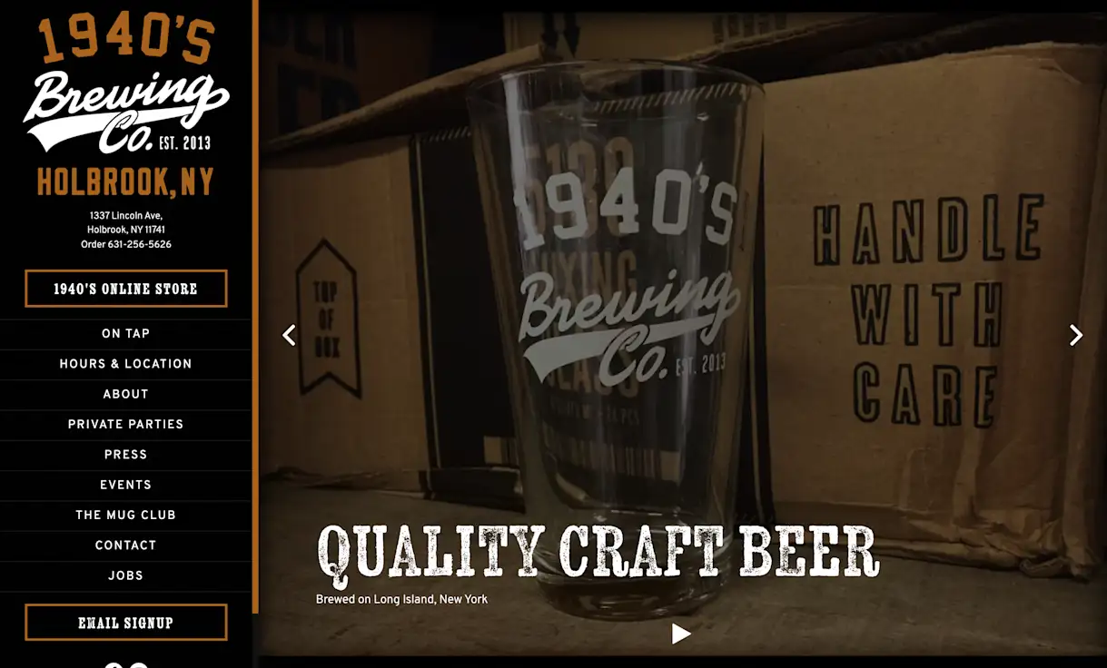 1940’s Brewing Co. in Holbrook, New York is an homage to the very year that owner Charles Becker’s father graduated from brewing academy and dedicated his career to the craft. The brewery’s branding exhibits this nostalgic and rustic identity. This website stands out to us for its use of a side navigation bar and strong call-to-action buttons to view what’s on tap and the chance to sign up for their newsletter.