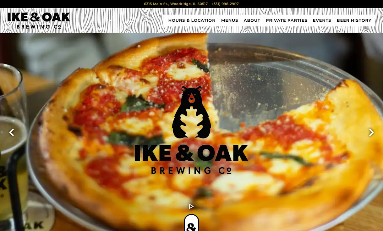 Ike & Oak Brewing Co. is a brewpub based out of Woodridge, Illinois serving handcrafted brews and artisan pizzas. Their branding and logo are front and center, making this website fun and informative. A highlighted “Gift Cards” tab in the main navigation calls for visitors to purchase digital gift cards — optimizing the website to drive revenue online.