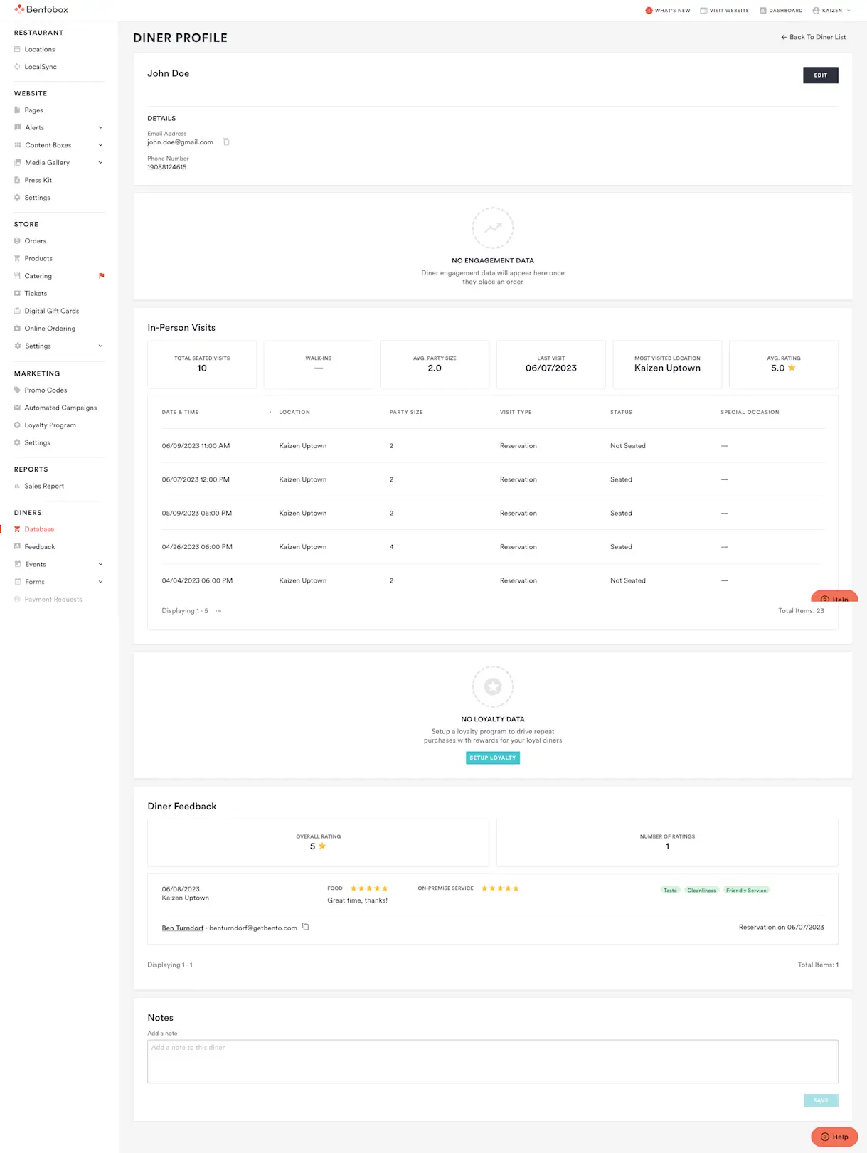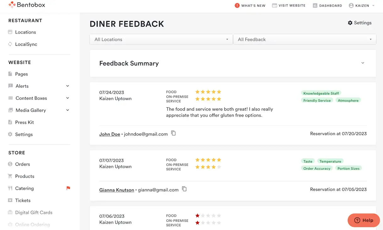 Any negative feedback from past guests will surface in Bento Book upon the guest’s next visit to help operators with service recovery.