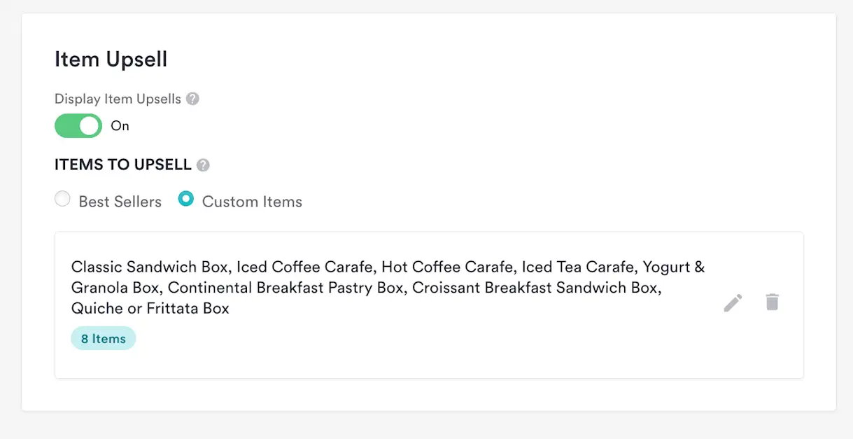 Restaurants using Pre-Order & Catering can now include item upsells on orders. (This was previously only available for Online Ordering).