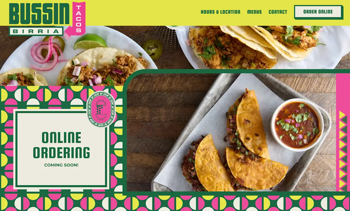 Contrast through differences in color, shape, and more can help guide a user through the site. Bussin’ Birria Tacos is a recently launched website for a taco joint located in the Mall of America. The photos of their birria tacos look amazing against their branding with vibrant colors and patterns, where most of the contrast lies. The neon yellow and bright pink play off the deep green color and show how fun this taco slinging joint is. The website alternates between sections with a full yellow background and crazy patterns, giving the user all the more reason to scroll through.